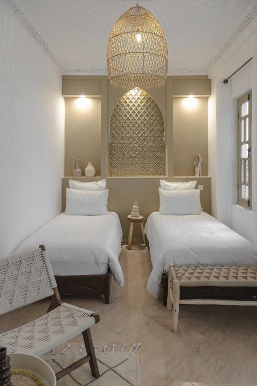 Le Riad propose plusieurs chambres doubles et lits jumeaux, idéales pour accueillir aussi bien des couples que des familles. Le nombre exact de personnes dépend de la configuration des chambres disponibles.